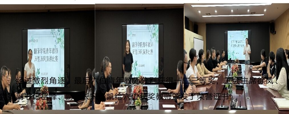 为落实立德树人根本任务,持续加强教职工思想政治引领、助推新时代师德师风建设、迎接70周年校庆,9月24日,翻译学院在801会议室举办青年教师师德师风演讲比赛活动。活动由党委副书记岳峰主持,学院领导、青年教师和其他教师代表参加。