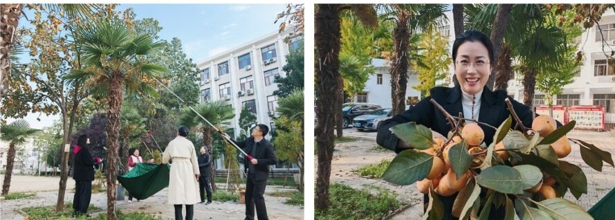 午后阳光和煦,心理学院楼前的柿子树已是硕果累累,橙红色的柿子如一盏盏小灯笼挂满枝头,成为校园里一道亮丽的风景线。采摘现场欢声笑语,气氛热烈。有的老师手持专用采摘杆,小心翼翼地套住高处的柿子,精准发力,果实便稳稳落入袋中;有的老师则默契配合,一人牵引枝条,一人负责采摘,协作无间。平日里严谨治学的教授、专注科研的学者们,此刻都化身快乐的“采摘工”,在亲近自然的过程中放松了身心,享受着劳动带来的纯粹乐趣。采摘过程不仅是对果实的收获,更是一次心灵的减压与团队凝聚力的升华。